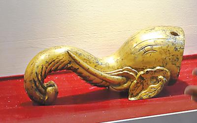 同時(shí),我們注意到發(fā)掘于圓明園大宮門遺址御河內(nèi)的銅鎏金象首,象牙微挑,眉目傳情,脈絡(luò)清晰,閃閃發(fā)亮,吸引游客駐足欣賞?!般~鎏金象首的制作工藝要遠(yuǎn)遠(yuǎn)在十二生肖之上,是清代皇家用器精品”,張利芳說。據(jù)悉,銅鎏金制品目前挖出僅此一件。