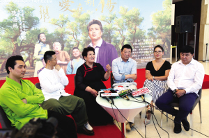 德德瑪(左三)和《愛在胡楊》主創(chuàng)人員接受媒體采訪。 王珍攝