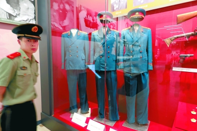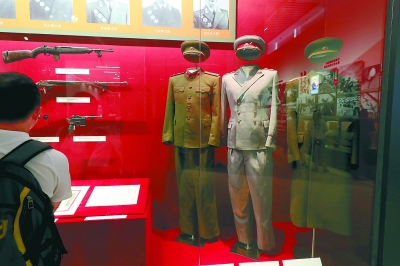 展廳中段,一面高大的玻璃通柜里,五五式元帥禮服、五五式元帥棕色常服、五五式元帥白色常服,兩套一級(jí)勛章以及一些開(kāi)國(guó)將帥使用和收藏的武器陳列其中。