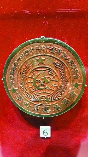 來(lái)到“在土地革命戰(zhàn)爭(zhēng)中誕生成長(zhǎng)”展區(qū),可以看到明亮的玻璃柜里陳放著一枚醒目的大印,即“中華蘇維埃共和國(guó)執(zhí)行委員會(huì)人民委員會(huì)革命軍事委員會(huì)”印。
