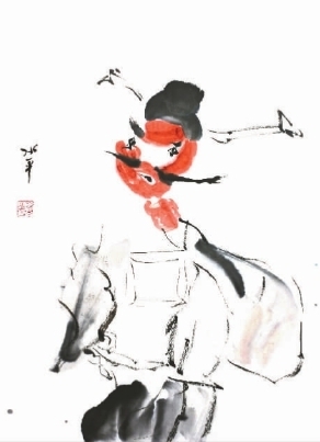 葛水平一面寫作,一面畫畫,文學(xué)與藝術(shù)的雙重推衍,啟開“我之為我,自有我在”的天性。她的畫與傳統(tǒng)的文人畫有著明顯的距離,徑自呈現(xiàn)出一種鮮活趣味;尤以山鬼系列頗具野獸派畫風(fēng)。作為符號(hào)形式映現(xiàn)原始人類圖騰崇拜的山鬼,在職業(yè)畫家那里是美輪美奐的仙妖化身,在葛水平筆下卻是頭插山花、豐乳肥臀的村婦,全然沉浸于自得其樂的喜悅,靜寂里發(fā)散出一股莫名的熱情。角色內(nèi)心活動(dòng)的特殊肢體語(yǔ)言,不掖不藏,明明白白;筆墨明快飽滿,透著厚實(shí)的生命力。