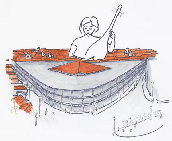 典型上海老弄堂,無天井,無抽水馬桶,曾是周璇、趙丹說笑,掛鳥籠的布景。1990年發(fā)明了新式馬桶,底部有粉碎器,一切可以打碎,沖入下水管道,重點(diǎn)銷售對(duì)象,就是這類民居的人們。 ——《繁花》插畫
