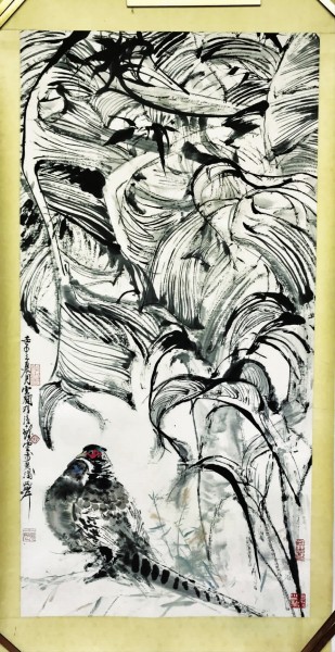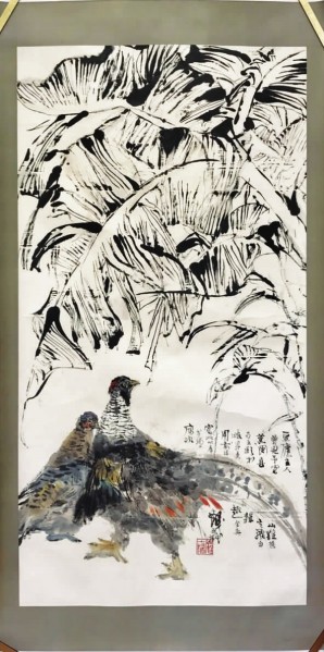 一個(gè)星期后,發(fā)老來封短信,讓我有空去他家里。隔日,我去了。發(fā)老借租的一棟三層小樓里,住了好幾戶人家,都是美術(shù)系統(tǒng)的“革命群眾”,只有發(fā)老一人是墨墨黑的“黑畫家”。夏天,因?yàn)橐L(fēng),門窗都開著,發(fā)老十分謹(jǐn)慎,踱到這扇門外張一張,又去那扇門外望一望,確定沒人,便迅疾地從床席子下面拿出一封信,說:“這里面就是你那天‘黑畫展’上看到的,按那意思畫的。你回去再打開看。”回到家里,我便迫不及待地打開觀賞。畫得真好,但總是沒有“黑畫展”上那張畫彰顯的肆無忌憚、目空一切的雄渾奇氣 (下圖右)。過了幾天,我到發(fā)老家去,“發(fā)老,謝謝您啊,那張畫畫得非常好,但我總感覺‘黑畫展’里的那張更好。”發(fā)老說:“這張你先拿著,將來如果有一天,云開日出,那張畫能發(fā)還給我的話,我還送給你?!?978年,發(fā)老終于得到平反,恢復(fù)了黨籍,當(dāng)時(shí)那批被批判的“黑畫”也統(tǒng)統(tǒng)發(fā)還給他。發(fā)老毫不猶豫地將那些畫作捐給了畫院,唯獨(dú)將那四尺整張 《芭蕉錦雞圖》贈(zèng)予了我。這前后兩張 《芭蕉錦雞圖》可是要“子子孫孫永寶之”的。