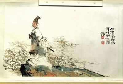 程十發(fā)先生做人膽小,攻藝膽壯,畫畫構(gòu)思快、下筆快,落筆生春,常常有出人意表的獨(dú)造。他的畫特多那個(gè)時(shí)期的畫家很少有的隨心馳意,靈氣迸發(fā),富于浪漫氣息?!拔母铩敝?,我曾請發(fā)老畫過一張“世人皆醉我獨(dú)醒”的 《屈原》 (見題圖)。國畫不同于電視等動(dòng)態(tài)表演,要以一個(gè)靜態(tài)的畫面表現(xiàn)時(shí)代背景、人物情緒、心理演繹,具有很大的挑戰(zhàn)性。而他構(gòu)思的屈原面朝向左,左邊留白逼近宣紙邊緣,有碰壁感。畫上屈原立于一片崖石盡頭,身后鋪排的是渺??臻g,下方則是倒流的汨羅江水,巧妙地營造出屈原走投無路,準(zhǔn)備用自己的生命來證明自身的清白和對國家的忠貞。其實(shí),發(fā)老處理屈原的站位,就已將其報(bào)國無門的苦楚、悲涼、憤慨、絕望、殉國的心境表達(dá)得一覽無遺,深刻呵深刻。我想這某種意義上何嘗不是發(fā)老的自況,唯一不同的是,他是始終相信光明在前的程十發(fā)。