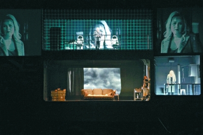 這是一版理念極其先鋒的制作,導(dǎo)演特雷林斯基對原作的重新構(gòu)建非常大膽。特雷林斯基導(dǎo)演將全劇三幕的劇情全部移植到鋼鐵戰(zhàn)艦上,這里看似僅僅是劇情發(fā)生地的簡單變動,但其實充滿了“合理性”層面的挑戰(zhàn)。特雷林斯基導(dǎo)演以大范圍的視覺調(diào)度解決了這一難題。第一幕“九宮格”式布局的戰(zhàn)艦橫截面,將船艙分割為九個獨立的空間,第二幕則實現(xiàn)了從頂層甲板的控制室到底層彈藥艙的轉(zhuǎn)換,第三幕觀眾的目光又聚焦在封閉的病房中,如果細(xì)細(xì)算來,觀眾在劇中一共看到了四層、十二個不同的視覺空間,同樣體量的布景足夠完成一部電影的拍攝。如此豐富的舞臺設(shè)計為男女主人公留下了足夠的表演區(qū)域,也解決了觀眾長達(dá)五個小時觀演中視覺上的枯燥乏味,當(dāng)然最重要的是讓劇情的每一步發(fā)展都足夠自然流暢。在第三幕中,特里斯坦以大段篇幅回憶自己的一生,特雷林斯基直接將童年記憶以實景呈現(xiàn),燒焦的木屋赫然出現(xiàn),極為寫實的木屋與鋼鐵戰(zhàn)艦的氛圍形成強烈對比,將原本理解難度巨大的唱詞與童年傷痕聯(lián)系在一起,即使初次接觸這部歌劇的觀眾,也不難感受到其中的凄慘。