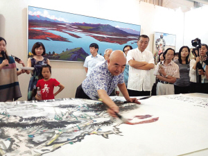 五國藝術(shù)家在活動(dòng)現(xiàn)場(chǎng)共同創(chuàng)作巨幅作品《山水相連》。孫文振攝