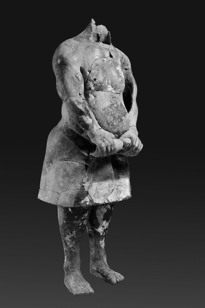 1999年,秦陵又有新驚喜——陵園東南角的百戲俑坑揭開了神秘面紗的一角。首次搶救性試掘,試掘面積僅72平方米,出土了目前在秦陵地區(qū)發(fā)現(xiàn)的體積、重量最大的一件青銅鼎以及11件陶俑。這些陶俑姿態(tài)各異,風(fēng)格、服飾、裝束等都與兵馬俑截然不同,多數(shù)上身赤裸、肌肉發(fā)達,有的像持竿人,有的像角力者。經(jīng)過考證和研究,初步認為他們可能是象征著秦代宮廷娛樂活動的百戲俑。