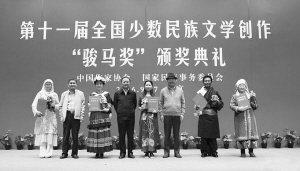 2016年9月27日,第十一屆全國少數(shù)民族文學(xué)創(chuàng)作“駿馬獎”頒獎典禮上,國家民委副主任李昌平(左四)為中短篇小說獎獲獎?wù)哳C獎。 資料圖片