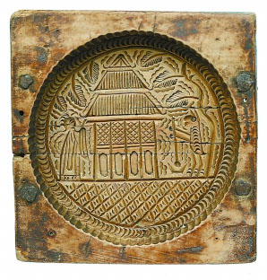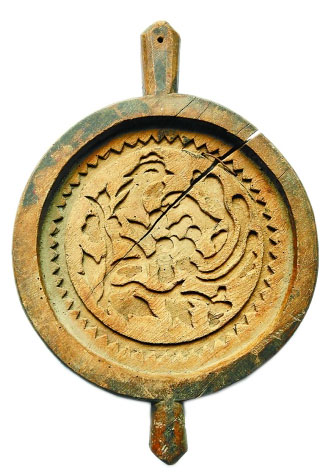 “鳳穿牡丹”是月餅?zāi)>咧械囊患y得的佳品,是于進江在舊貨市場一堆老家具當(dāng)中偶然發(fā)現(xiàn)的,模具上落滿灰塵,有些裂紋。其造型獨特,具有雙把手形式。這種樣式在宋元時期比較多,明代以后就少了。此款是明嘉靖年間的作品,雕刻風(fēng)格簡潔明快。畫面中的鳳凰在太陽的光芒下活靈活現(xiàn)。鳳穿牡丹的紋樣在明代早期的瓷器、服飾上較為流行。在這件模具上還留有墨跡題刻,記錄主家的姓氏、制作時間??梢娫趥鹘y(tǒng)月餅的制作上,也有為家族手工定制的。現(xiàn)如今,月餅制作很少再沿襲手工的習(xí)俗,月餅?zāi)>咭搽x開了人們的視線。