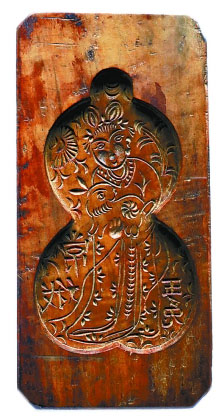 這款民國制作的較為特殊的異形月餅?zāi)>摺案5撏病保怯谶M江在多年前從一位藏家手中“換得”的。而交換的籌碼是當(dāng)年還被視為“稀有品”的手機。葫蘆紋樣在古代備受推崇,但是作為異形葫蘆的月餅?zāi)>邊s極為難得。而在紋樣的選取上,一般是“喜”字、“壽”字和“玉兔”,單獨的嫦娥玉兔卻很少見。不同于傳統(tǒng)的技藝,這塊模具將仕女圖的繪制技法融合其中??梢姡谛⌒〉囊粔K模具上也大有乾坤,無論是民間藝術(shù)品還是大師佳品,都是多元藝術(shù)元素融合的結(jié)晶。