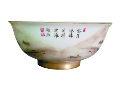 琺瑯彩瓷器中的山水樓閣是常見(jiàn)的表現(xiàn)手法,傳世稀少,十分珍貴。雍正琺瑯彩墨彩山水樓閣人物碗是很有代表性的一件。所謂墨彩,是在白地上繪黑彩。通常以黑地繪五彩或三彩的叫黑彩,墨彩所呈現(xiàn)的簡(jiǎn)約、單純、嫻靜使這種瓷器達(dá)到應(yīng)得的效果。