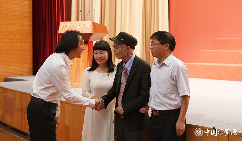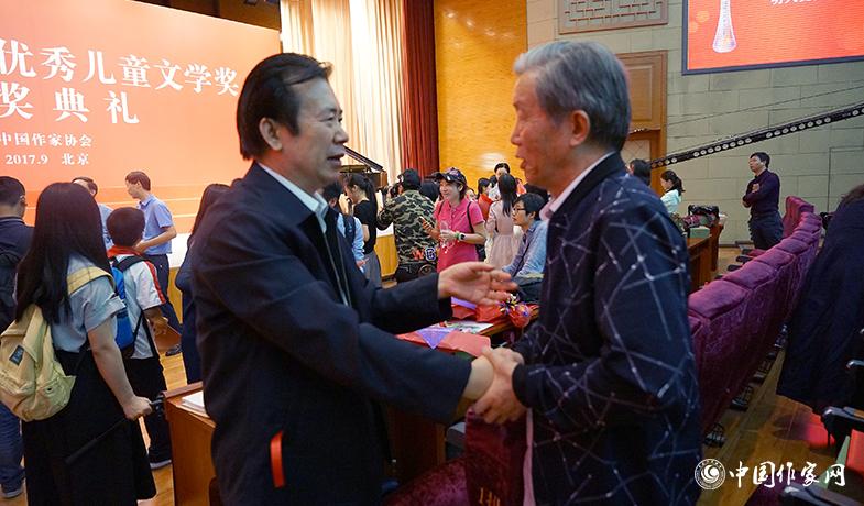 獲獎(jiǎng)作家張煒、李少白在頒獎(jiǎng)典禮結(jié)束后握手交談