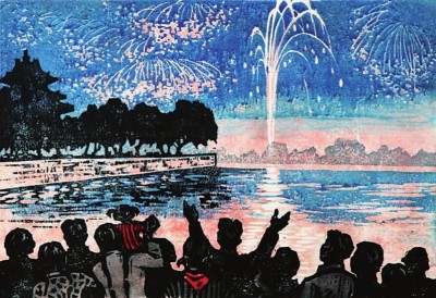 聚焦觀賞煙花,“新興木刻運(yùn)動(dòng)”先驅(qū)之一的李樺也曾留下作品,那是以套色版畫形式創(chuàng)作的 《國慶之夜》。遠(yuǎn)處,一簇簇?zé)熁饹_上云霄,如花瓣般繽紛四落;近處,是觀賞的人們一字排開的背影,其中一位張開雙臂的男子與一個(gè)坐在大人肩頭的孩童都是點(diǎn)睛之筆。人群與煙花之間,隔著波光粼粼的湖水,最是讓這幅畫從一眾描繪國慶觀賞煙花的美術(shù)作品中脫穎而出,只見寧靜與祥和從一派熱鬧的氛圍中透出。