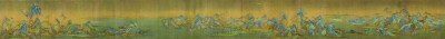 《千里江山圖》的青綠是對中國山水傳統(tǒng)的一次回望,更是對晉唐青綠的致敬與挑戰(zhàn)。在一個18歲少年的畫筆中,他將遠久的古意在宋代的絹素上煥發(fā)出了青春的光彩。經(jīng)過了唐五代的探索———寫實造型與空間營造的問題似乎已經(jīng)解決,因此宋人的青綠可以將注意力集中在色彩魅力的盡情顯現(xiàn)?!肚Ю锝綀D》明艷、大膽得前無古人,層層厚涂,白粉提醒,輝煌耀目,天空的顏色上深下淺,五色斑斕的山水漂浮在宇宙之中,顯得遼闊而神秘。再見趙伯駒、趙伯嘯的《江山秋色》的青綠似不比王希孟的耀眼燦爛,而更有種雍容富貴的流華,青綠的流淌,穩(wěn)健而得體,是一種成熟的風(fēng)韻。趙伯嘯的《萬松金闕圖》,水墨與青綠相融相間,既有自然主義傾向又具典雅與文氣,開文人青綠山水之先河,成為了吳門文、仇青綠一脈的宗祖。