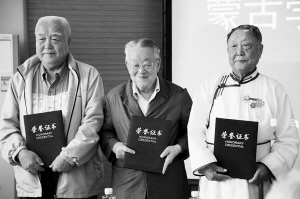 今年9月,內蒙古大學舉行“蒙古學研究60年”校友論壇,向創(chuàng)建蒙古語言文學專業(yè)的元老確精扎布教授(右一)及歷史學專業(yè)的元老等頒了發(fā)榮譽證書。資料圖片