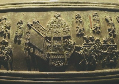 鹵簿鐘此番在博物館里是裸展,雖然設(shè)了一個(gè)矮圍欄,但絲毫無(wú)礙探身細(xì)看,因此每個(gè)細(xì)節(jié)都?xì)v歷在目,鑄在鐘上的“千里江山圖”也是如此。不過(guò)既有《鹵簿鐘的年代研究》在先,則仍以照引為宜:“鹵簿鐘身飾紋第四層,凸鑄一條橫繞鐘身一周的山水紋帶。這條飾紋帶,是由三段相同的畫面相連結(jié),構(gòu)成一幅氣勢(shì)磅礴,山勢(shì)連綿的山水圖卷。就其畫面內(nèi)容,擇其一段,則可窺其全貌。畫面取景作橫卷式,以六座高山前后交錯(cuò)布列,成為整個(gè)畫面的中心。六座高山分前后兩排,形成一條由右向左的狹長(zhǎng)山谷,由于前排三山的遮擋,在畫面上形成了三個(gè)空間:第一個(gè)空間,右下角有一行者趕著毛驢,將從溪上小橋走過(guò),沿著前方的夾谷山路而去。在其右邊的山谷里,一勞作者似荷鋤而歸。在其前上方的山腳下,有一茅屋隱約可見(jiàn)。第二個(gè)空間,是由左面相連的三山和左面一山相對(duì),中間出現(xiàn)一條斜長(zhǎng)的