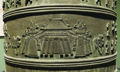 銅鐘通高1.84米,八波曲的鐘腳,鐘身由五道弦紋分隔為六層。第一層是鑄有二龍搶珠鈕(蒲牢)的鐘頂,第二至第四層鑄作鹵簿圖,便是革車、指南車、相風(fēng)烏輿和乘輿亦即輅的“三車一輿”以及各持儀物的百數(shù)十人的“旗仗”和“宮衛(wèi)”,其下是如同長(zhǎng)卷的一周山水圖,青龍、白虎、朱雀、玄武與云朵上的四組仙人分別鑄在鐘腳的八個(gè)波曲。