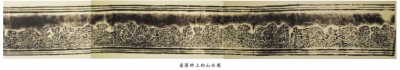 山谷,溪水沿谷底而流。左上方,有一亭式建筑倚立于左三山的山坳之前。右山腳下的溪水邊,停泊著一小木舟,景象異常恬靜。第三個(gè)空間,則是第二個(gè)空間左三山向左的延續(xù),在畫面最左面的山坳間,亦有兩座茅屋隱現(xiàn)。有的茅屋頂上挑著一面小旗,是為酒肆的標(biāo)志。從整個(gè)畫面看,近景是峰巒迭嶂,遠(yuǎn)景則是山勢(shì)連綿。樹木、溪流、小橋、木舟、茅屋、酒肆等點(diǎn)綴其間?!薄熬望u簿鐘飾紋帶所表現(xiàn)的山水題材來(lái)說(shuō),也具有北宋繪畫中山水長(zhǎng)卷的時(shí)代特征?!?/p>