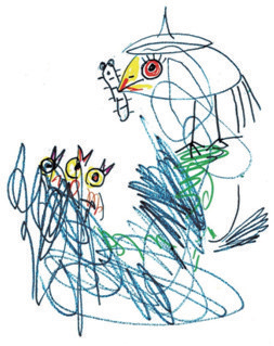 女兒亂涂亂畫(huà)一通后,在紙上留下了亂麻似的線(xiàn)條,我左看右看也沒(méi)能找出形的傾向。我只好把這團(tuán)亂線(xiàn)當(dāng)鳥(niǎo)巢,加幾筆便成了這幅鳥(niǎo)媽媽給鳥(niǎo)寶寶喂食的畫(huà)。