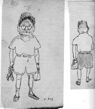 轉(zhuǎn)眼到了今年9月末,我請孔夫子網(wǎng)的同志來收舊書。我父親的外文書和中文書都分別捐給了社科院和現(xiàn)代文學(xué)館,還剩下一些馬列著作沒拿走。看著這幾箱書我犯愁,難道就當(dāng)廢品處理嗎,我不忍。孔夫子網(wǎng)的劉杰來看過,她認(rèn)為大部分他們可以收走。我如釋重負(fù),為這些書籍能繼續(xù)發(fā)揮作用而高興。就在他們整理圖書做書目時,意想不到的事發(fā)生了:在父親的一本舊書里,發(fā)現(xiàn)了高莽先生的兩幅舊作。那是在干校時高莽先生畫我父親的速寫,一幅畫正面,另一幅是背影。