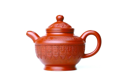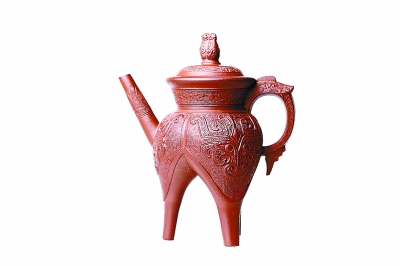 蟠壚壺的原型是“大明宣德?tīng)t”。該壺器型端莊古樸,線條流暢,質(zhì)地紅潤(rùn)。壺身巧飾八條夔龍紋帶,與壺鈕的鏤空云龍合數(shù)為九,象征九五至尊。它是青銅器紋飾與紫砂裝飾藝術(shù)相融合的代表作,既滿足紫砂藝術(shù)的創(chuàng)新要求,又完美呈現(xiàn)了成型工藝、裝飾工藝、材料工藝和燒制工藝的精髓,無(wú)愧于“文質(zhì)并茂足可傳世的紫砂鴻寶”。