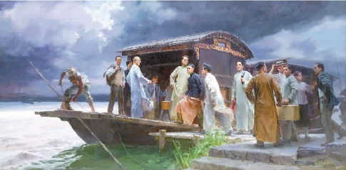 在我心中兩張稿子都是難以割舍的。在整個構(gòu)思的過程中,我反復(fù)查閱了大量有關(guān)一大的資料,其中一大代表的生平深深地觸動了自己,深感一大代表身上都流淌著要改變舊中國的一腔熱血。他們當(dāng)時是一群年輕的、自覺的、渴望肩負(fù)國家及民族命運的知識分子,暫且不說其中某些人的歷史命運發(fā)生了何種變化,我的內(nèi)心很希望能將參加南湖會議的全部代表都在畫中有所表現(xiàn)。所以,我在畫稿中盡量想安排好每個代表出場位置。根據(jù)李達(dá)夫人王會悟的回憶,南湖紅船并不能直接??繜熡陿乔暗拇a頭,而是停在湖中,由一只小船(稱拖捎船)往來于碼頭與大船之間接送客人。如果表現(xiàn)這樣方式上船,很難表達(dá)出我想將一大代表全部畫進(jìn)去的初衷,于是我設(shè)想一大代表由碼頭邊的跳板上船,這樣的安排可以將一大代表較為輕松地安排在畫面中。而且這樣畫面容易體現(xiàn)出會議的莊重,然后我盡量加重畫面的色調(diào),強(qiáng)化了風(fēng)雨前的效果,將光線斷斷續(xù)續(xù)地集中在代表身上,使畫面的神秘感有所加強(qiáng),也使較多的人物在空間展開時有主次之分。這張構(gòu)圖在人物表現(xiàn)的主次關(guān)系中,側(cè)重于2002年中共黨史新編中的排序,突出了李達(dá)、李漢俊、陳潭秋和董必武的地位,青年毛澤東則緊隨其后。后來,在我的合作者黃發(fā)祥老師的協(xié)助下,歷時七個月的緊張工作,完成了這張5米長、 2 . 5米高的創(chuàng)作。作品完成后的效果基本達(dá)到了預(yù)期要求。
