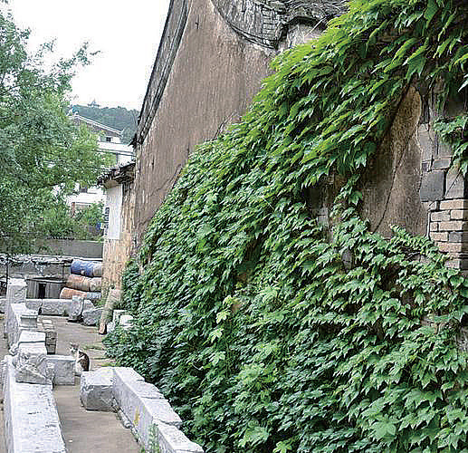 僅從外觀上就可以做出判斷,那是一幢兩進(jìn)式建筑,一前一后兩個(gè)院落。外墻的墻皮早已被風(fēng)雨和歲月剝蝕殆盡,磚石清晰可辨。后進(jìn)院落的墻上密密麻麻的一片翠綠,好一路爬山虎。再定睛一瞅,就連那牛軛似的屋脊上,灰突突的斷瓦間,竟也生了些許潦亂而稀疏的野草。