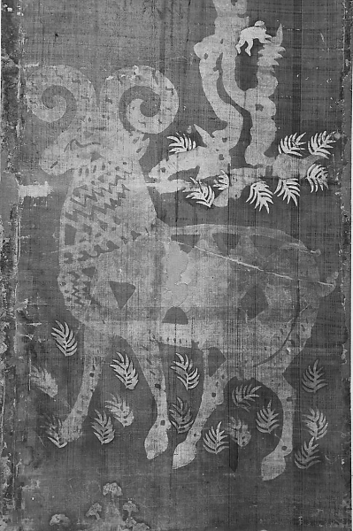 這個屏風(fēng)高1.63米,染成黃色后上蠟,然后再染紅色,這樣上蠟的部分就形成了圖案:一株大樹下站著一只卷角羊,羊身上有幾何形圖案。這個屏風(fēng)不光工藝精美,更是古代絲綢之路交流的重要例證。根據(jù)屏風(fēng)上的墨書記錄,這個屏風(fēng)是751年之后在日本制作的,然而上面的卷角羊原產(chǎn)于伊朗,當(dāng)時的日本人是不可能見到的,那這個屏風(fēng)是怎么設(shè)計的呢?很顯然,中間的關(guān)鍵環(huán)節(jié)就是中國唐朝。