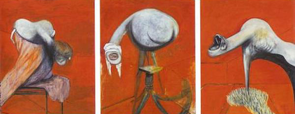 《以受難為題的三張習(xí)作》(Three Studies for Figures at the Base of a Crucifixion 1944)是培根的成名作,用油彩和油蠟筆在一種木質(zhì)纖維壁板上創(chuàng)作的。這幅畫是基于古希臘“悲劇之父”埃斯庫羅斯(Aeschylus)的作品《復(fù)仇女神》(Eumenides)。畫的背景以焦橙色為主,以基督教祭壇畫的經(jīng)典形式三聯(lián)畫(triptych)構(gòu)成,每格中分別有一個扭曲的擬人動物。