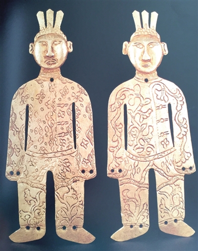 這兩件人形金飾件(如圖)高9.1厘米,最寬處3.6厘米,重28克。1988年于赤峰市阿魯科爾沁旗花根塔拉遼墓出土,赤峰市阿魯科爾沁旗博物館收藏。