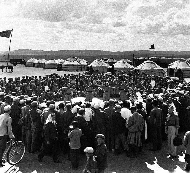 達斡爾族攝影家思勤從1947年在《內(nèi)蒙古自治報》(現(xiàn)改為《內(nèi)蒙古日報》)工作。在他數(shù)十年的新聞攝影生涯中,拍攝了許多關(guān)于烏蘭牧騎的珍貴照片,其中既有烏蘭牧騎的演出場景,也有作家老舍、詩人納·賽音朝克圖與烏蘭牧騎交流的畫面,為烏蘭牧騎的發(fā)展史留下了深刻的印跡。從這些照片中可以看到,烏蘭牧騎隊員們與人民群眾親如一家,有著昂揚的精神風貌。