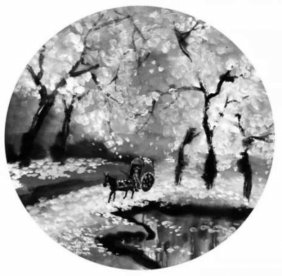 一幅水墨畫的背后“暗藏”詩句:漫天落花似流水,輕車馬騎穿林過,正是“縱被春風吹作雪,絕勝南陌碾成塵”的寫照。選自林帝浣創(chuàng)作的《中國詩詞大會》背景圖。