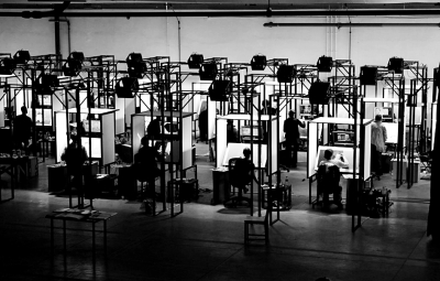 為了解決這些復(fù)雜的問題,制作團(tuán)隊(duì)開發(fā)了名為PAWS(Painted Animation Work Stations)的工作站系統(tǒng),它包含了相機(jī)、電腦、投影、監(jiān)視器、光源和畫布等。每位參與的畫師都經(jīng)過了短期的培訓(xùn),有一個(gè)開放的相對獨(dú)立的小格子間工作站,既可相互交流,又能互不打擾。之前由演員實(shí)景拍攝、數(shù)字繪景所創(chuàng)建的動畫視頻作為參考物布置在畫布上方,或者投影在畫布上。畫師能夠更加專注于繪畫本身,一幀接一幀地畫下去。重復(fù)繪制的數(shù)量視很多情況而定,比如鏡頭的運(yùn)動、人物的數(shù)量、運(yùn)動的形式等,精確地控制每一幀的精度。最后,后期制作人員將油畫師們繪制的油畫通過電腦合成,制作成風(fēng)格統(tǒng)一的油畫電影。