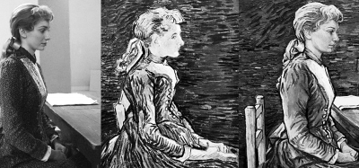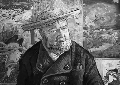 為了保證貼近梵高的客觀視角,多洛塔并不想添加任何非梵高創(chuàng)作的畫,但為了敘述電影故事的完整性,她不得不在繪畫之上添加更多的場景。于是在電影中,彩色的鏡頭是梵高繪畫中的人物和場景,代表著梵高的視野;而類似閃回的黑白鏡頭則不是梵高繪畫中的場景,是創(chuàng)作者為了完善劇情而設(shè)計(jì)的場景延伸,基于那個(gè)年代的黑白攝影,讓影片展現(xiàn)梵高生活中的一些重要片段。