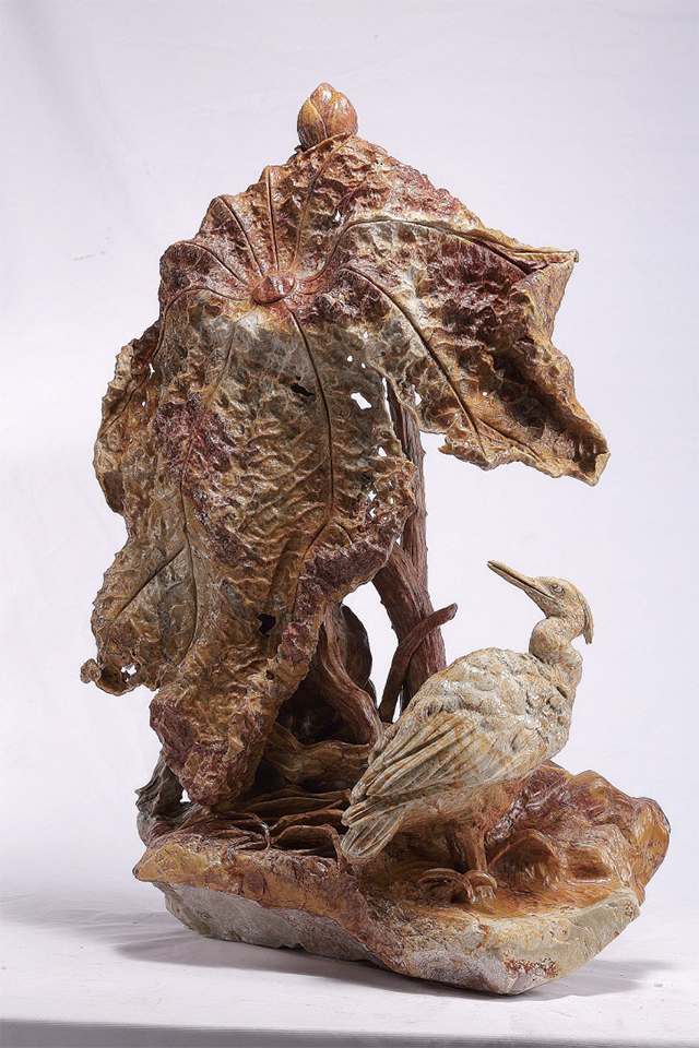 陳禮忠作為馮久和的學生,是新中國成立后壽山石藝術(shù)第三代的代表性傳人。他的作品不僅繼承了傳統(tǒng)的文人氣質(zhì),同時又契合時代精神。他創(chuàng)作的小山子清靜文雅,以寫意手法入刀法,追求山水畫可居可游、隱幽出世的意境,足見其傳統(tǒng)功力深厚。他的荷花系列和翎毛系列,均體現(xiàn)了傳統(tǒng)圓雕技法與當代雕塑語言的融合,具有鮮明的陳式風格。他的《天地兒女》《三峽》等大型山子創(chuàng)作,則體現(xiàn)出了更為大氣、空間感更強的創(chuàng)作思想和胸懷。