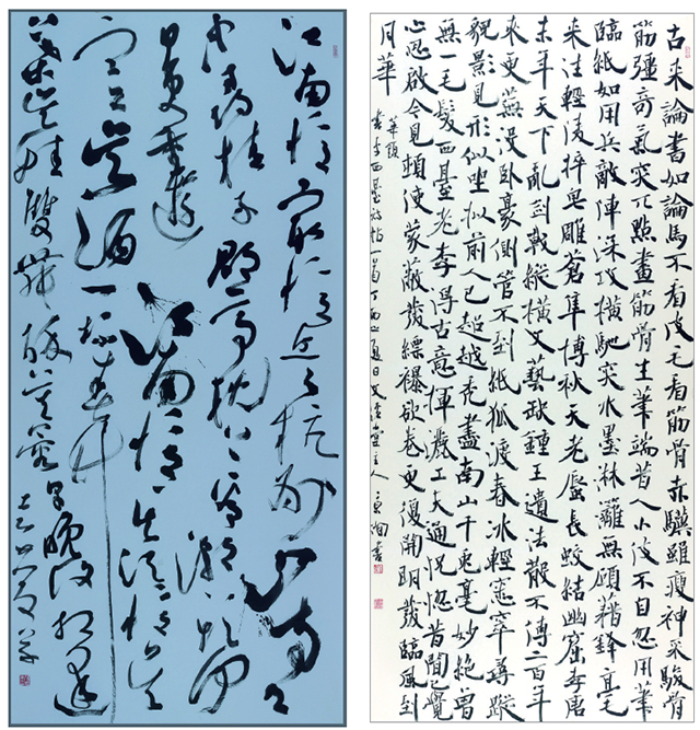 自2011年起,“沈門七子書法展”已分別在滕州、北京、南京、濟(jì)南、成都、張掖等地舉辦了六屆,此次展覽是第七屆。七年來,“沈門七子”在沈鵬“弘揚(yáng)原創(chuàng)、尊重個(gè)性、書內(nèi)書外、藝道并進(jìn)”16字方針指引下,嚴(yán)格遵從其教學(xué)理念,深挖傳統(tǒng),植根經(jīng)典,相互切磋,取長(zhǎng)補(bǔ)短,取得了顯著成績(jī)。他們的作品傳統(tǒng)功力深厚,藝術(shù)感染力強(qiáng),既有傳統(tǒng)筆墨語(yǔ)言,又有鮮明的現(xiàn)代氣息。其筆法運(yùn)用的熟練度、線條墨色的表現(xiàn)力、章法構(gòu)圖的掌控力,使作品具有強(qiáng)烈的畫面感和震撼力。同時(shí),他們繼承古人又異于古人,形成了各自富有特色的面貌和藝術(shù)語(yǔ)言:王厚祥的大草縱橫馳騁,揮灑自由,線質(zhì)蒼茫,千姿百態(tài);劉京聞筆意線質(zhì)古樸厚重,欹正變化,疏密相間;龍開勝五種書體均有很好表現(xiàn),楷行尤佳,結(jié)字凝練平和,不激不勵(lì),風(fēng)規(guī)自遠(yuǎn);周劍初五體兼習(xí),大字雄渾蒼茫,小字險(xiǎn)峻耐品,古拙瀟灑;李明大字楷書線質(zhì)老到、結(jié)字開張,小楷沉著痛快、疏密得當(dāng),行書悠然自得;張志慶的大字行草線質(zhì)蒼茫老辣、章法疏密相間,小字行草溫文爾雅;方建光深得“二王”意韻,用筆自然,變化豐富,又參以米意,結(jié)字奇崛,耐人尋味。他們通過多次展覽,與各地書法家形成了良好互動(dòng),不僅廣受關(guān)注,并收獲了許多寶貴的經(jīng)驗(yàn)和建議,使其在藝術(shù)上不斷取得進(jìn)步。