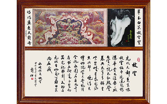 “上帝揮毫數(shù)億年,文房四寶默蒼玄。云石圣詔貞觀殿,水墨丹青漢代縑。霞客古城評(píng)畫苑,鼎堂大理吐云煙。奇珍異寶詩(shī)風(fēng)骨,境界天人藝術(shù)巔。 ”