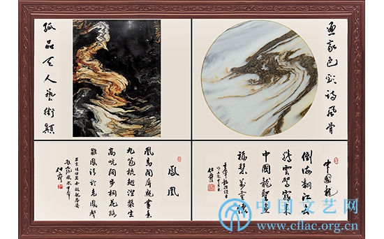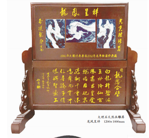 深受古人點(diǎn)評(píng)石畫的啟發(fā),我在收藏天然石畫中,運(yùn)用自題詩(shī)詞和書法,對(duì)天然石畫進(jìn)行了諸多闡釋。天然大理石畫詩(shī)書及木刻合璧成屏風(fēng),是大自然的鬼斧神工與人文情懷的完美結(jié)合,這種有獨(dú)特藝術(shù)特征的藝術(shù)品,具有很高的審美價(jià)值,蘊(yùn)含著深邃的文化內(nèi)涵。有幅名為《龍飛鳳舞》的大理石天然畫藏品,我曾書題《五絕中國(guó)龍》 :“倒海翻江去,騰云駕霧來。中國(guó)龍圣畫,?;廴f靈懷。 ”龍騰引得雛鳳歌, 《七絕鳳凰》油然而生:“凰鳥開屏觀畫意,九苞梳翅涅槃生。高吭邁步桐花路,雛鳳清於老鳳聲。 ”畫中所呈現(xiàn)的龍的傳人呼風(fēng)喚雨的神威與鳳凰開屏般的輝煌未來,令人浮想聯(lián)翩,嘆為觀止。