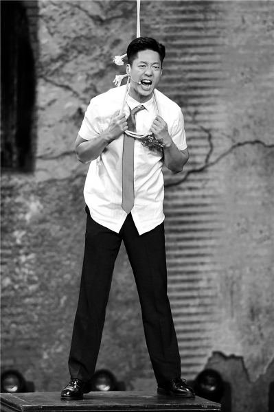 另一段則是凌瀟肅沖上桌子準備上吊時,吼起了那段關(guān)中民謠:“他大舅他二舅都是他舅,高桌子低板凳都是木頭,金疙瘩銀疙瘩還嫌不夠,天在上地在下你娃甭牛。”凌瀟肅透露,這是原劇本中沒有的,也是他自己加入的“神來之筆”。他說,在排練前他專門看了一遍《最愛》電影,片中郭富城演這場上吊戲的時候很寫實,但在轉(zhuǎn)換成戲劇演出時,從床邊快步走上桌子,再拉著繩子上吊,整個過程沒有對話,他覺得太干了,太浪費這個距離了,只憑借肢體動作也根本表現(xiàn)不出人物這時候的心情。于是他想到了在演《關(guān)中匪事》時經(jīng)常哼唱的這首歌謠,頓時覺得非常合適。