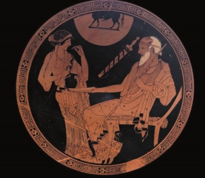一只阿提卡杯的杯身圖像,展示了赫卡墨得為涅斯托耳調(diào)制美酒的場(chǎng)景,約制于公元前490年,意大利Vulci地區(qū)