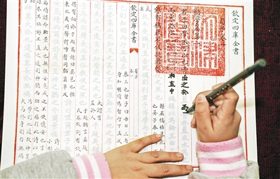 后來由于戰(zhàn)火不斷和保存不善,只有三部原本保存到今天。其中,國(guó)圖藏文津閣《四庫(kù)全書》是唯一一部原書、原函、原架保存至今的。文津閣《四庫(kù)全書》共有36304冊(cè),分裝于6144個(gè)木質(zhì)書函,擺放在128個(gè)書架上。它在承德安靜地存放了近130年,后來為了籌備京師圖書館,又從承德運(yùn)回北京。1915年,當(dāng)時(shí)的京師圖書館終于正式入藏了這部珍寶。之后九十余年中,全書又歷經(jīng)四次搬遷,終于白石橋總館北區(qū)落成之后存于稽古、右文廳。據(jù)透露,讀者抄寫內(nèi)容為文津閣《四庫(kù)全書》本:《詩(shī)經(jīng)·關(guān)雎》、《論語·學(xué)而》和《荀子·勸學(xué)》。