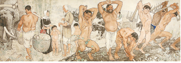 徐悲鴻曾將“獨(dú)持偏見,一意孤行”作為自己的座右銘,作為徐悲鴻的學(xué)生,在1986年春節(jié)至1989年9月的四年間,楊先讓率領(lǐng)考察隊(duì)伍十四次出入黃河流域考察民風(fēng)、民俗、民藝,足跡遍及青海、甘肅、寧夏、陜西、山西、河南、山東、河北等八個(gè)?。▍^(qū))。在考察中,隊(duì)員扛著錄像、攝影器材,口袋里揣著那個(gè)時(shí)代特有的介紹信和各省聯(lián)絡(luò)人的地址,隨身攜帶筆記本,隨時(shí)隨地記下所見的民藝品和民俗風(fēng)情。楊先讓先生和《徐悲鴻》同時(shí)推出的《黃河十四走》以每次考察的時(shí)間為章,分析了其藝術(shù)風(fēng)格、地域特色、反映的民俗風(fēng)貌、折射的文化內(nèi)涵等,并記錄下當(dāng)時(shí)優(yōu)秀的民間藝人(如劉蘭英剪紙、蘇蘭花剪紙、潘京樂皮影等)。本書為世人揭開了黃河流域民間美術(shù)的神秘面紗,為中國的傳統(tǒng)文化留下了寶貴資料。(圖為《徐悲鴻》內(nèi)文頁 徐悲鴻畫作《愚公移山》)