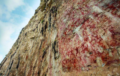 我看過廣西的花山巖畫,數(shù)十處有巖畫的巖陰延續(xù)數(shù)十里。這些巖畫中可以辨別出幾十種不同的顏色。飲食、采集、捕魚、狩獵、舞蹈、歌唱、生殖、死亡、喪葬……夕陽西下的時候,山的斷層變成了單純的色塊,被斜陽熏陶得光熠四射。有無數(shù)根古樸而美麗的線隱藏在巖石上。那些線深深刻出遠(yuǎn)古時代的生活。魚和鳥以及許多的人體器官構(gòu)成了這種生活。簡潔、單純、童貞、古拙、神秘、剛烈、含蓄、抒情、抽象、金石之韻……旋轉(zhuǎn)的東方線條神秘而游離,穿越太空,遏制著有序的日月星辰,抽象的符號火炬一般在空中搖曳,勇敢的精靈銜著希望之矢撲向太陽,黑色的鳥主宰著天空,如命運之神游刃于黑紅相間的大色塊之間?!疤斓嘏c我并生,萬物與我為一”,古人繪出了感人至深的圖畫故事。