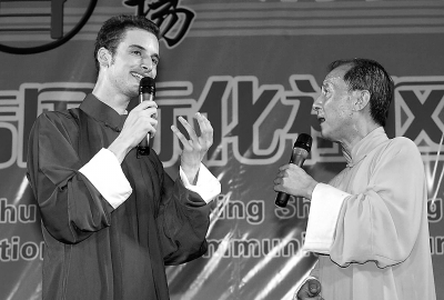 2005年7月5日,丁廣泉與法國弟子朱利安為社區(qū)居民表演相聲。新華社圖