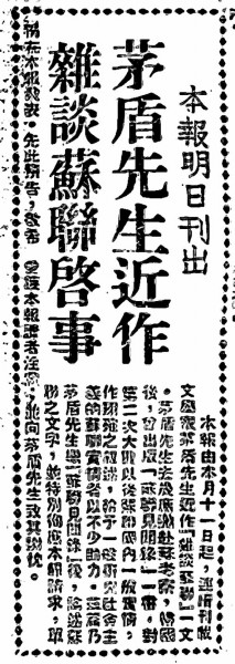 本報由本月十一日起,陸續(xù)刊載文學(xué)家茅盾先生近作《雜談蘇聯(lián)》一文。茅盾先生去歲應(yīng)邀赴蘇聯(lián)考察,歸國后,曾出版《蘇聯(lián)見聞錄》一書,對第二次大戰(zhàn)以后蘇聯(lián)國內(nèi)一般實情,作翔確之?dāng)⑹?,給予一般研究社會主義的蘇聯(lián)實情者以不少助力。茲篇乃茅盾先生繼《蘇聯(lián)見聞錄》后,論述蘇聯(lián)之文字,并特別循應(yīng)本報請求,單獨在本報發(fā)表。先此預(yù)告,敬希愛護本報讀者注意,并向茅盾先生致其謝忱。
