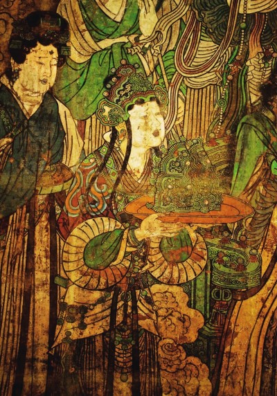 壁畫是人的精神世界的“物化”形態(tài),圖式亦不過是以情為橋,將作畫者對(duì)于生命精神的感知,絲絲入扣地輸送給后世的人們;他們仿佛把熱氣騰騰的情感植入一面面冰冷的墻土中,令其有了血肉、呼吸、脈動(dòng)以及蓬勃的生氣,以至于哪怕千年之后,賞畫者的心也能穿透厚厚的墻壁以及歷史煙云,與作畫者對(duì)話、交織與共鳴。壁畫要呈現(xiàn)的,“不僅是畫,而應(yīng)是一切”,畫里的時(shí)空的綿延或頓挫,無不意蘊(yùn)著畫工的心智和情感,這導(dǎo)致畫中的內(nèi)容由具體的物象,發(fā)展到所思所想,最終升華為一種精神的抽象。壁畫總是用“符號(hào)”構(gòu)建、編碼著不同于創(chuàng)作者生活的世界——符號(hào)世界,這種“符號(hào)”又最終架構(gòu)出嚴(yán)肅、莊重、神秘、歡快等“意義”,比如,宗教畫以佛的宏大與包容、俗界的色相之美感化眾生,使其獲得審美滿足時(shí),心靈也得以升華。符號(hào)也好,色彩也罷,一切元素都在死的畫面中活過來,隱露出神秘又崇高的精神意味。由于抽象、晦澀的經(jīng)典義理被形象化,加之洞窟的朦朧光線和搖曳燈光也參與到這場(chǎng)“造境”的運(yùn)動(dòng)中,信眾于半虛半實(shí)的幻覺里,感受佛法的莊嚴(yán)、神圣和溫馨。到了當(dāng)下,藝術(shù)脫離宗教,獲得更加自由和廣闊的空間,想像力終究從神性、法性、天堂、凈土的云煙中,恢復(fù)原本所依據(jù)的人性、社會(huì)性、時(shí)代性、物質(zhì)性,現(xiàn)代人最高的心靈需要得到充分的滿足。