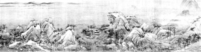 馮海濤:根據(jù)蔡京跋文及太清樓賜宴背景分析,這幅作品重點不是山水,而是隱士。在《江山圖》里畫了很多人物,不過都小如豆粒兒,如何能分清誰是誰呢?這涉及到手卷觀看方式,這樣大的手卷,信息含量巨大,閱讀時應從右至左依次展開,而不是一次性將作品完全陳列在眼前?!督綀D》的規(guī)模就決定了觀看只能是近距離的,這時人的視角所及基本上就是一個場景能夠獲得的空間,畫家正是利用手卷這種觀看特點來經(jīng)營畫面。以宋代繪畫理論來說,就是“山水先理會大山,名為主峰”,而其它山峰則如“百辟奔走朝會”,也就是畫面的動勢線都向主山匯聚。山水畫除了主山,還離不開主樹。通過手卷構(gòu)圖法則,《江山圖》中含有21幅相對獨立畫面。