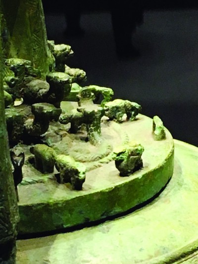 “這個銅盉借調(diào)到上海博物館展出時,我曾經(jīng)仔細看過,非常有意思?!瘪R老師把我們帶到一個中心展柜前,內(nèi)中展示的是由浙江省博物館送展的“螭紋提梁銅盉”。定睛看器蓋,只覺好似走進了動物園,上面立體地雕塑了犀牛、大象、老虎、熊、鹿等獸類,足有16只。在這些動物四周,堆塑著11條形態(tài)似蛇的螭龍,有的正在大快朵頤,有的昂首好似在下咽,有的豎起上身像在尋找獵物。“你看,這條螭龍在吃什么?”見記者似乎迷失在“動物園”中,馬老師靈機一動,掏出手機選好角度“咔嚓”一聲,而后指著手機屏幕道,“就是這條,你看它在吃什么?”熊建華問:“是不是青蛙?蛇吞蛙的主題很常見。”馬老師搖搖頭:“你們看,這眼睛瞪得大大的,嘴巴張開,高舉雙手……這是個人,他的腳已經(jīng)被螭龍吞啦!”聽到這兒,熊建華興奮起來:“你說,這會不會就是 ‘饕餮紋’的立體形象呀?”