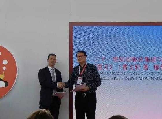 在本屆書(shū)展上,明天出版社還簽訂了張煒先生的作品《尋找魚(yú)王》的葡萄牙語(yǔ)、高棉語(yǔ),曹文軒先生的“曹文軒說(shuō)故事”系列、秦文君女士的作品《寶塔》的尼泊爾語(yǔ),劉海棲先生的作品《畫(huà)家馬西西和臭屁大王》阿拉伯語(yǔ)的版權(quán)等十多項(xiàng)輸出合約。