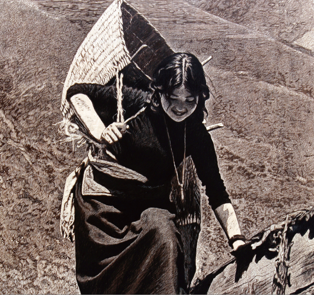 此次展出的獨(dú)版畫多來(lái)自徐匡年輕時(shí)扎根西藏的題材,我們能從畫面中讀出他對(duì)少數(shù)民族地區(qū)人民的熱愛(ài)和對(duì)美好生活的向往,徐匡擅長(zhǎng)作品的構(gòu)思和意境的營(yíng)造,對(duì)主人公微妙的感情及細(xì)節(jié)刻畫入木三分,他嫻熟的刀法又能讓畫面風(fēng)格達(dá)到松與緊、放與收的自如境界。這也是他的獨(dú)版藝術(shù)極具感染力的原因。